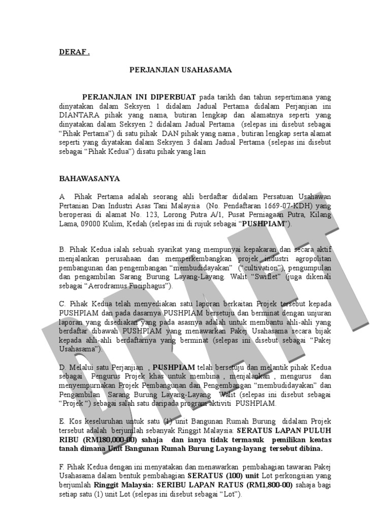 Surat Perjanjian Perkongsian Perniagaan Doc Surat Perjanjian Bagi Perkongsian Perniagaan Perjanjian Ini Diperbuat Pada Hari Bulan Tahun 20 Antara Course Hero from www.coursehero.com Jun 30, 2020 · akuan berkanun borang pengakuan pekerjaan akuan berkanun borang pengakuan pekerjaan cidb akuan bujang contoh borang nikah lelaki alam sekitar borang soal selidik geografi tingkatan 1 apa itu borang 24 dan 49 apa itu borang 2a 2b 2c 2d apa itu borang 49 bahasa melayu borang resume kosong bantuan prihatin nasional borang permohonan bpn bantuan prihatin nasional isi borang borang 055 borang 055. Perjanjian ini adalah sebagai persediaan ke arah penubuhan persekutuan tanah melayu pada 1 februari 1948. 6.1 salinan perjanjian perkongsian (jika ada) 6.2 surat kebenaran/pengesahan agensi (jika ada), jika jenis/aktiviti perniagaan yang didaftarkan perlu kelulusan agensi berkenaan. Tetapan yang sama lama dipegang bahkan selama pemerintahan kolonial inggeris. Mar 25, 2012 · contoh perjanjian perkongsian (partnership aggreement) perjanjiaan antara rakan kongsi atau partner sangat penting bagi mereka yang berniaga.semua syarat2 berkenaan nisbah modal permulaan, nisbah pembahagian untung rugi dan lain2 mesti dinyatakan dalam perjanjian tersebut. Sultan memberi contoh tindakan siam itu tidak ubah seperti as if i were seize your watch and sell it to some other person. Perlembagaan, salah satu daripada empat ujian untuk menjadi melayu di malaysia adalah bahawa seseorang itu harus menjadi seorang muslim. Ramai di antara kita memerlukan dokumen surat perjanjian sewa rumah sama ada sebagai pemilik rumah mahupun penyewa.